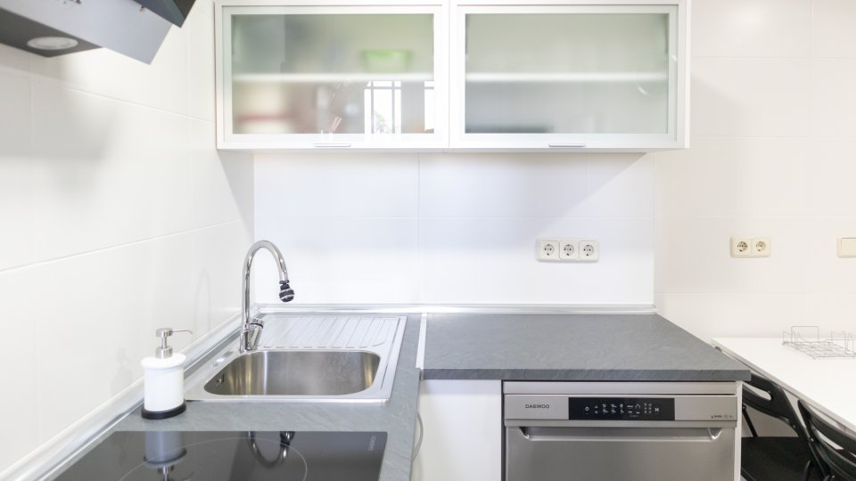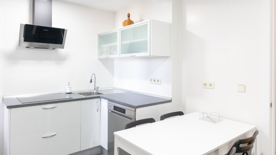 Desde el hall también accedemos a la cocina. Ésta es amplia y también luminosa. Dispone de todos los electrodomésticos, vitrocerámica, horno, frigorífico, lavadora, etc.