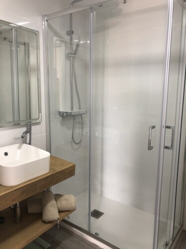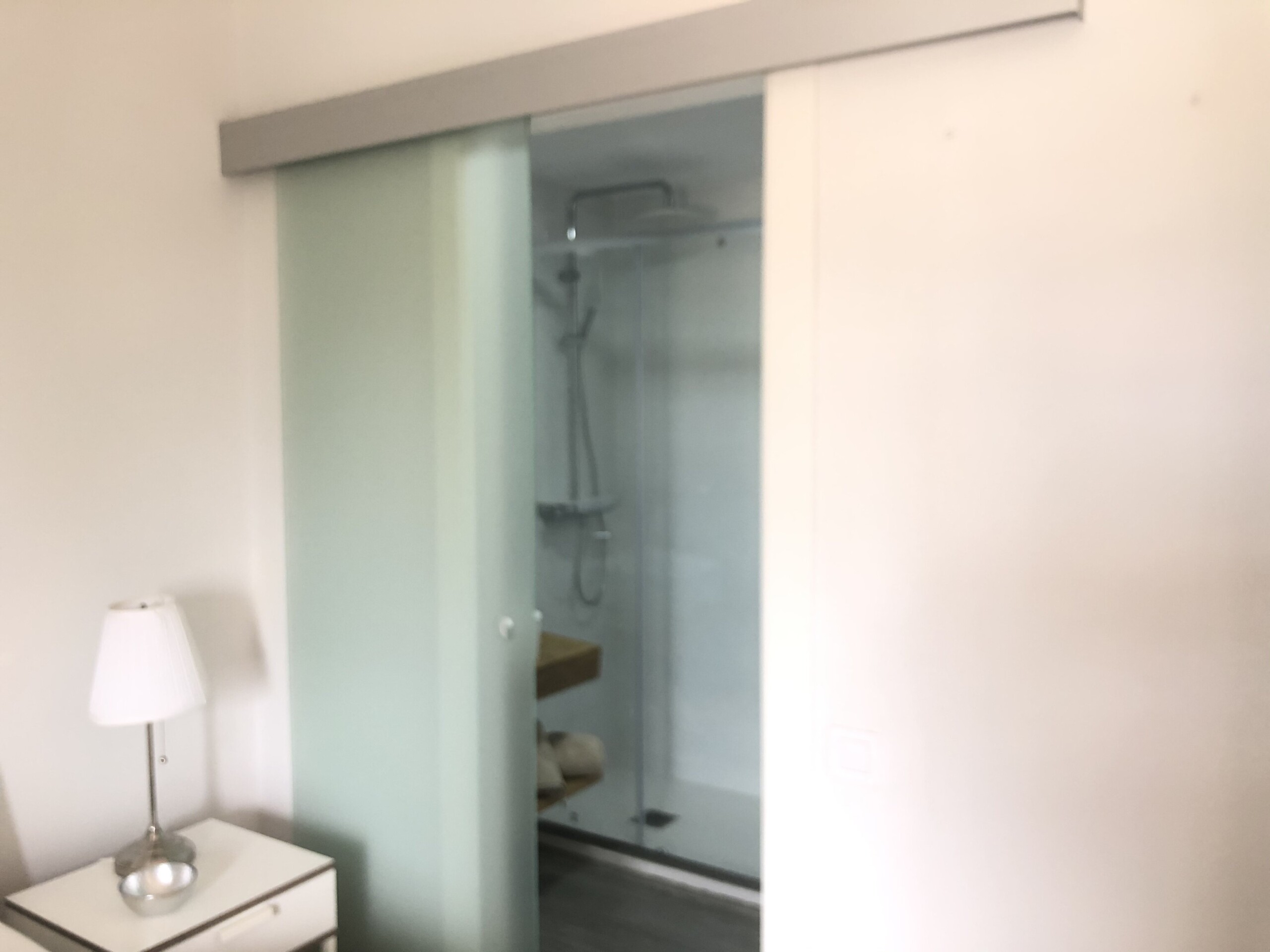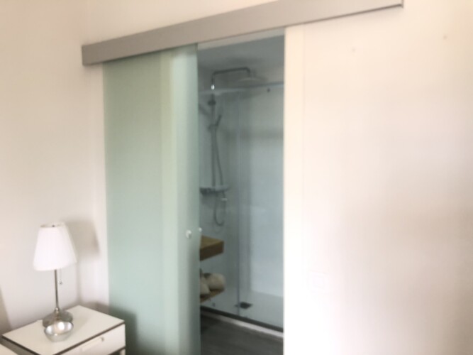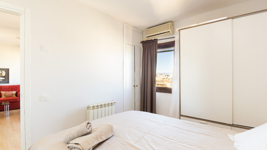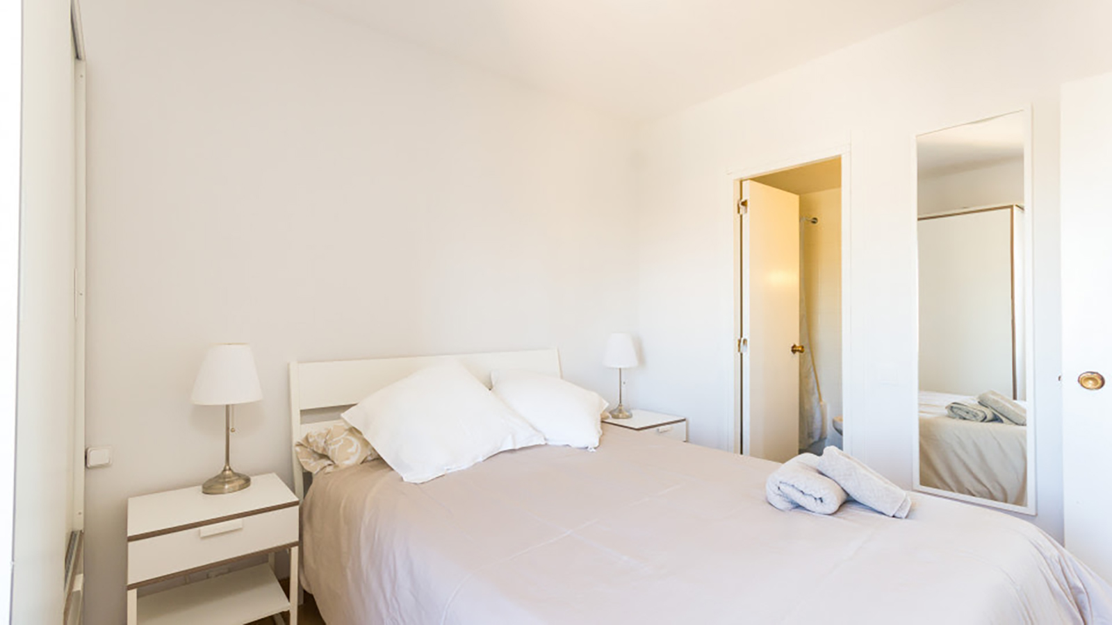 El dormitorio con cuarto de baño en suite (con bañera) dispone de una cama doble y de dos armarios, uno de ellos empotrado. También accedemos