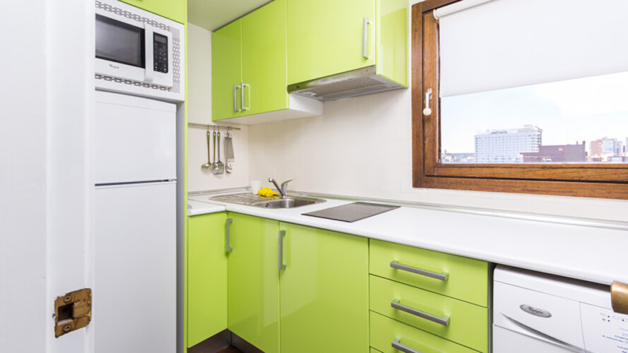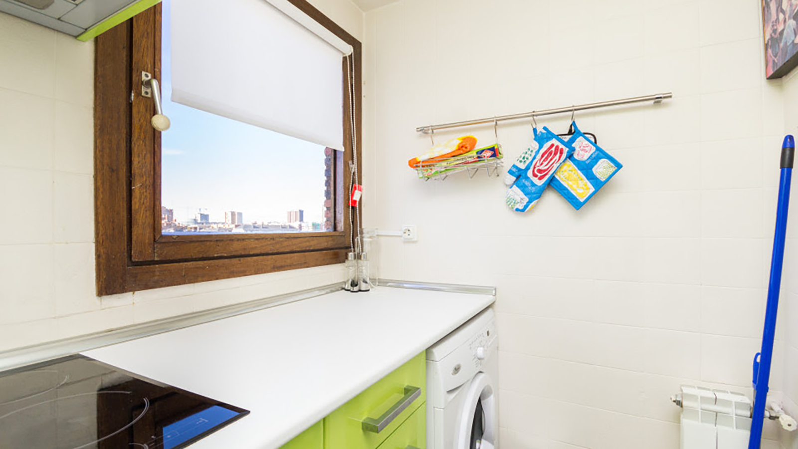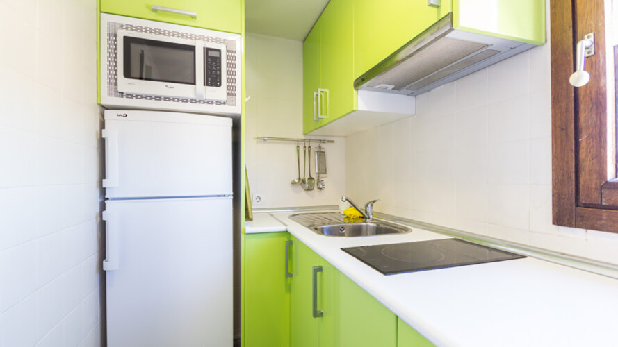 La cocina completamente equipada con lavadora, frigorífico, y microondas-horno.