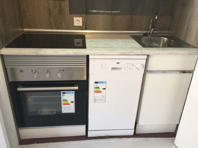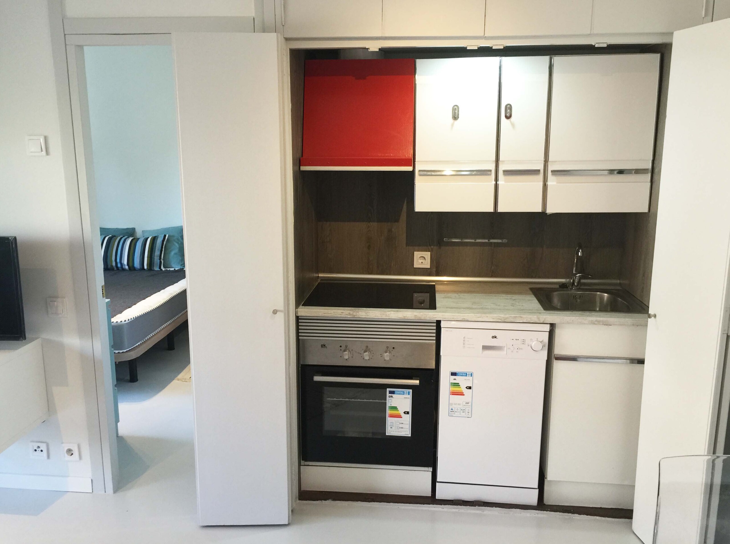 La cocina de estilo americano, equipada con los principales electrodomésticos, se integra de manera sofisticada en el salón comedor, oculta tras puertas de armario que aportan funcionalidad y estética.