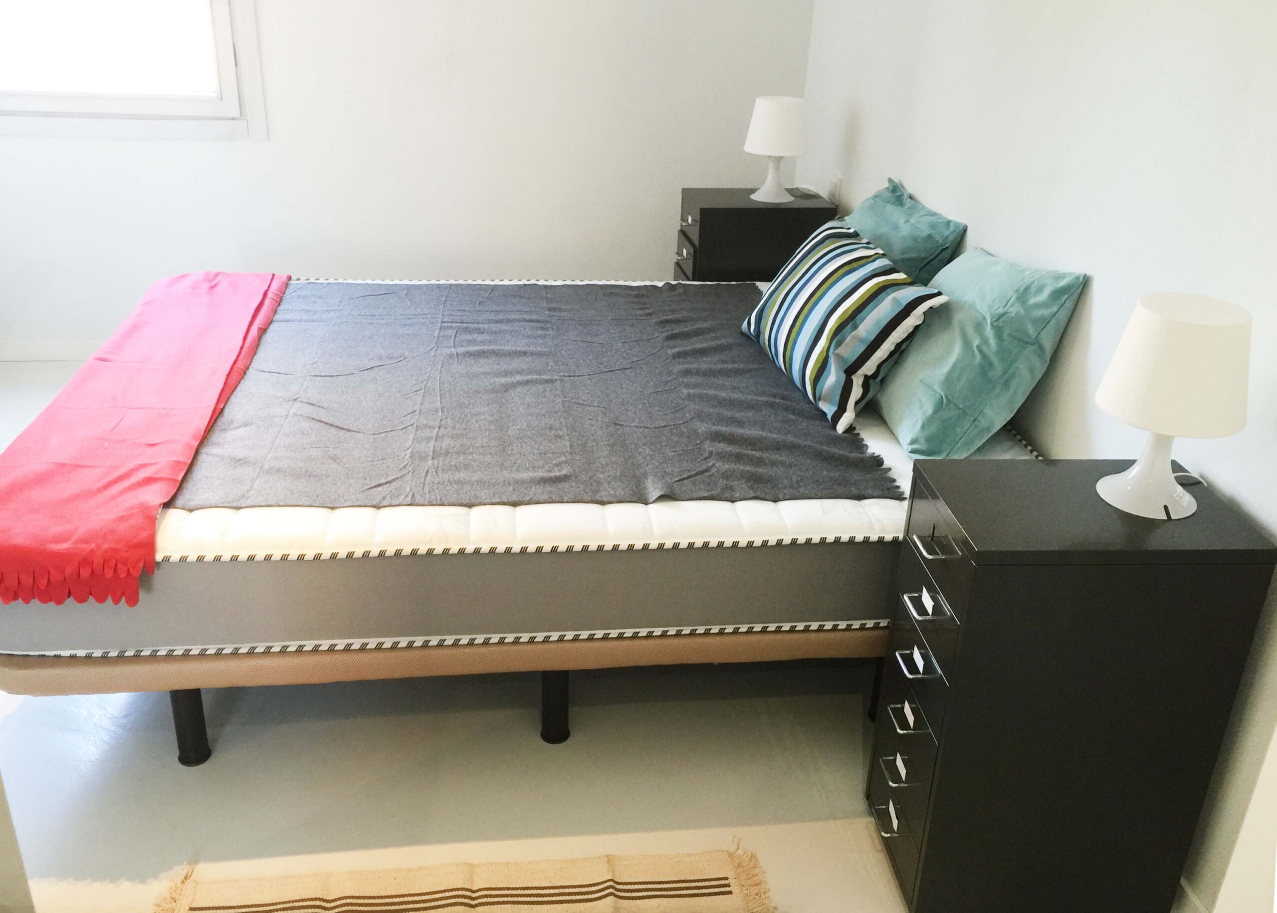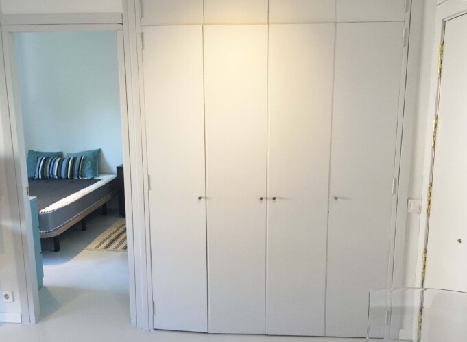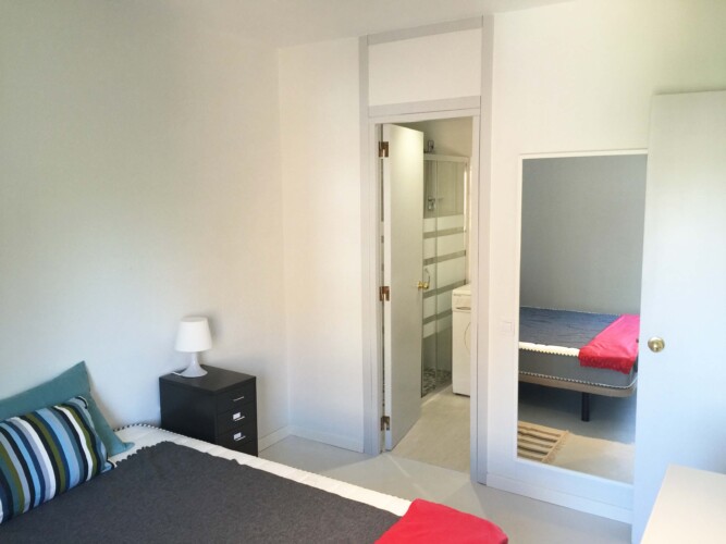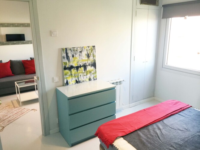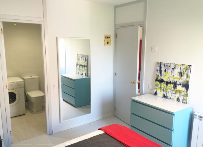 El dormitorio, con su cama de matrimonio y hermosa cómoda, ofrece un oasis de tranquilidad. Desde aquí, accedes al espacioso cuarto de baño con una generosa ducha.