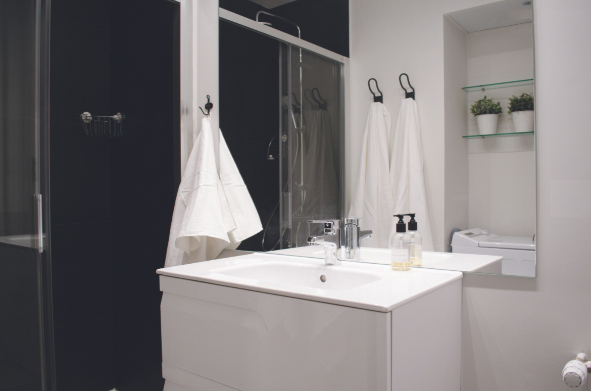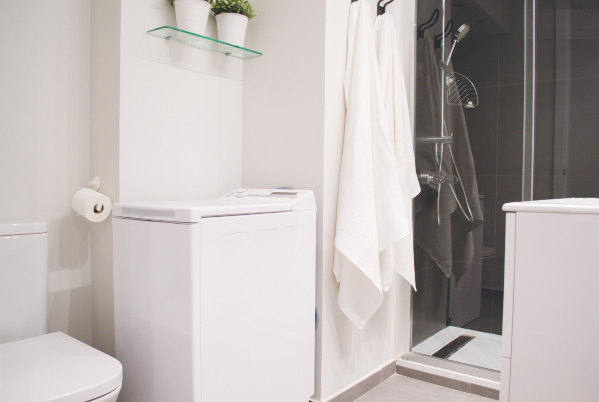 El baño completo incluye plato de ducha. De nuevo, todos los materiales son de calidad. En el baño se encuentra también la lavadora.