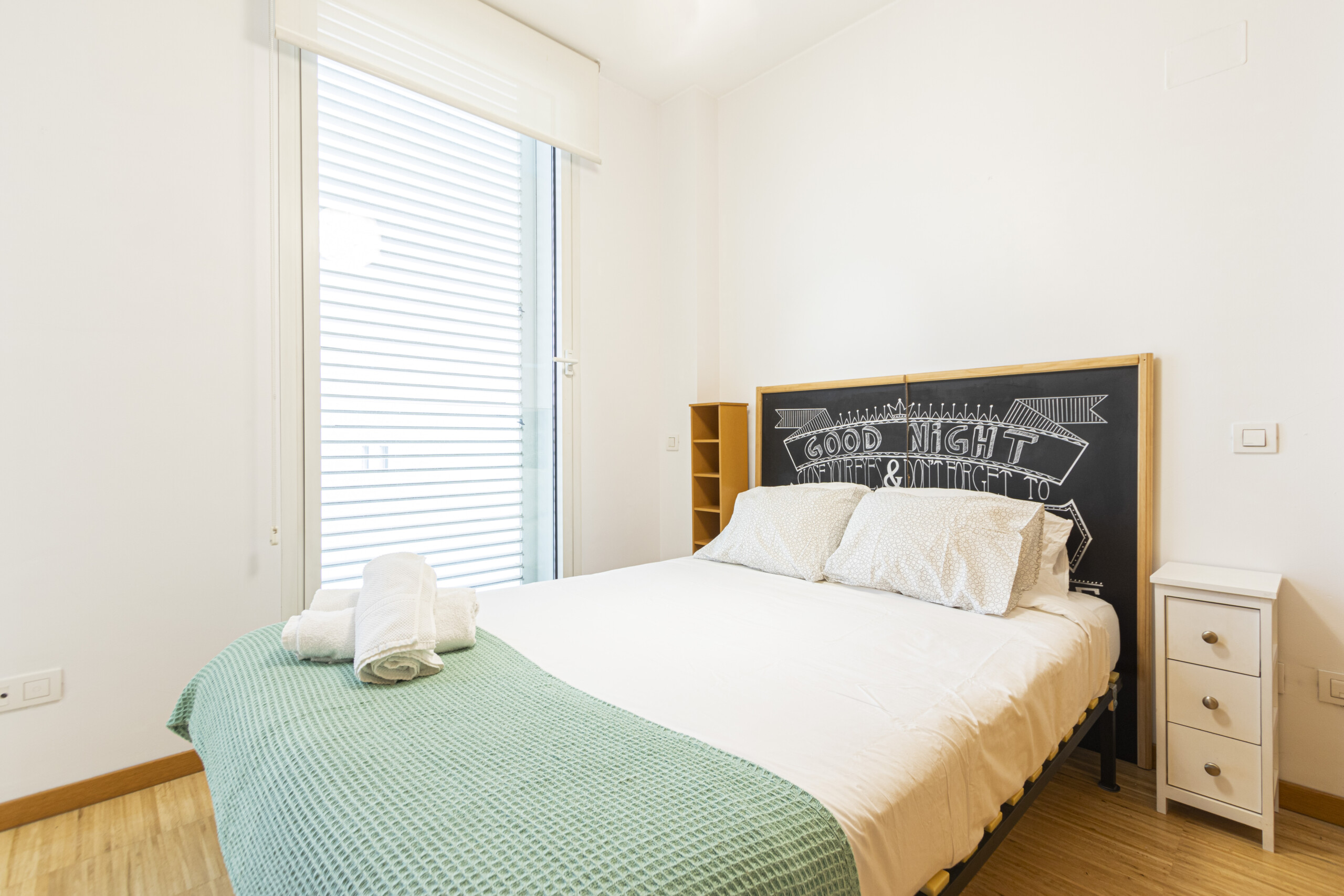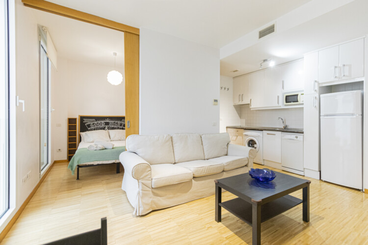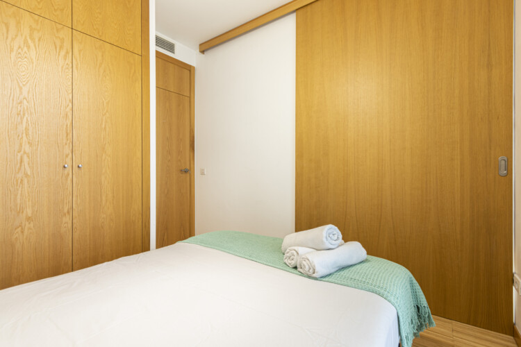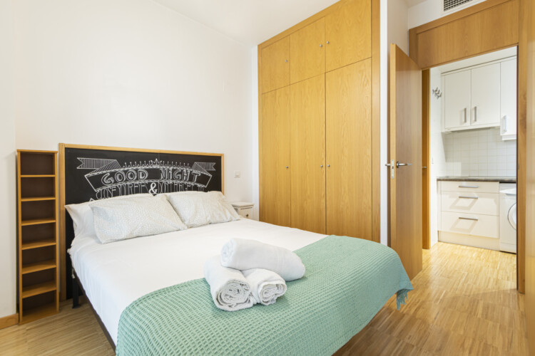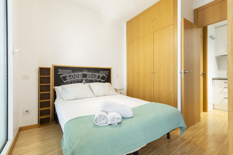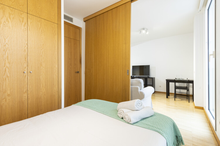El dormitorio, independiente del resto del apartamento se comunica con el salón comedor a través de una gran puerta corredera. Éste alberga una cama doble y un gran armario empotrado.