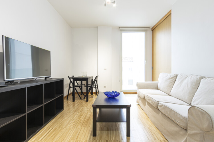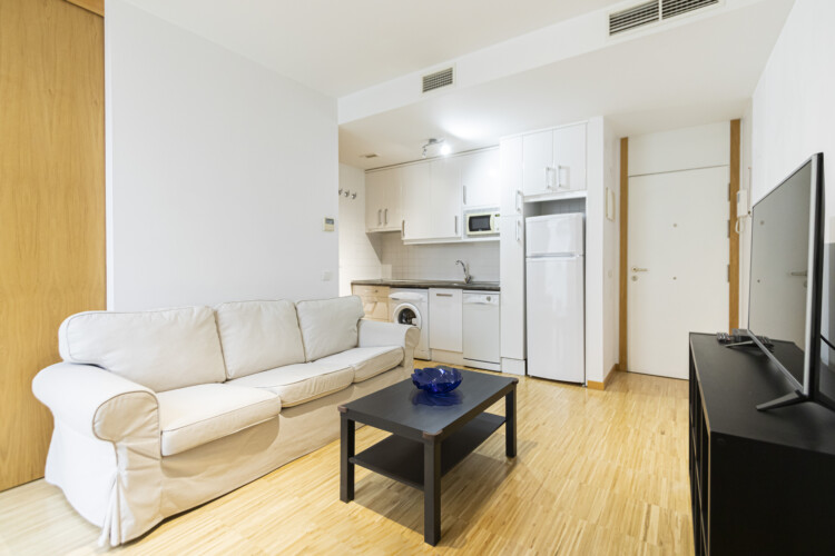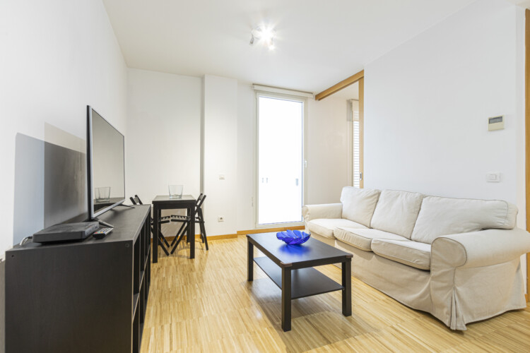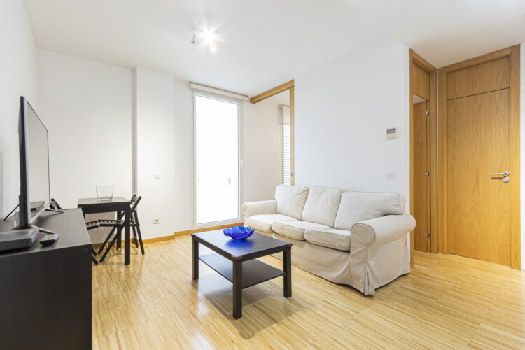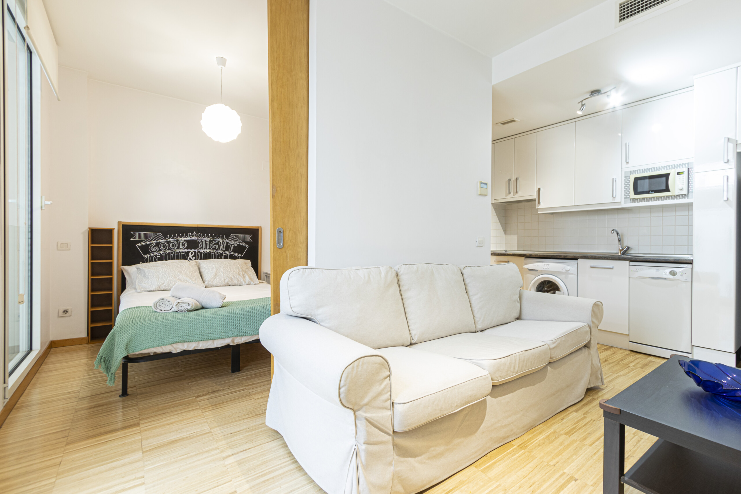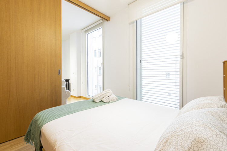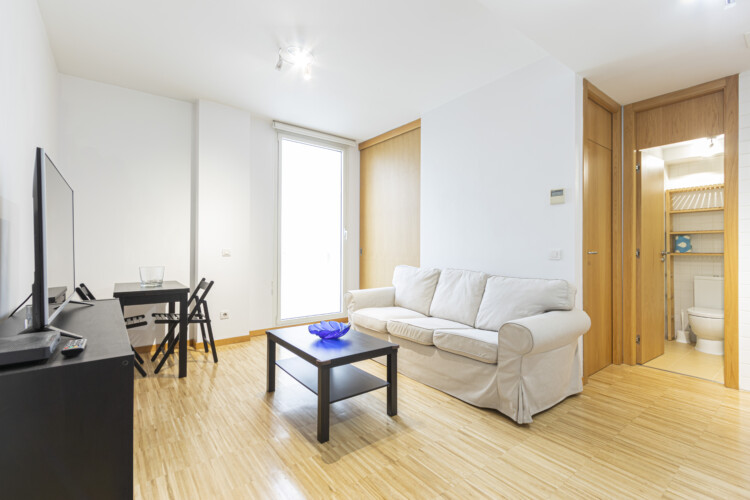 El dormitorio, independiente del resto del apartamento se comunica con el salón comedor a través de una gran puerta corredera. Éste alberga una cama doble y un gran armario empotrado.