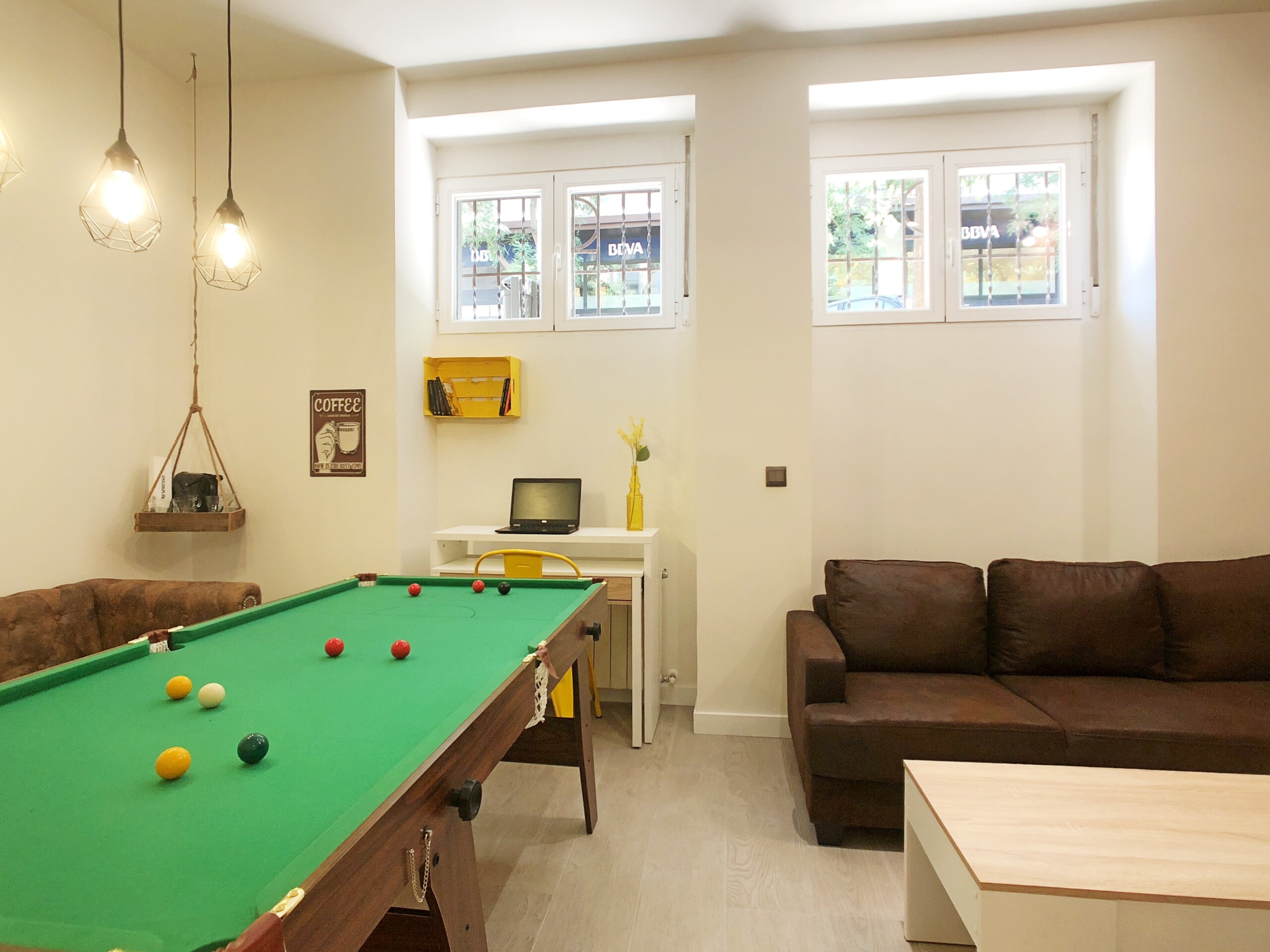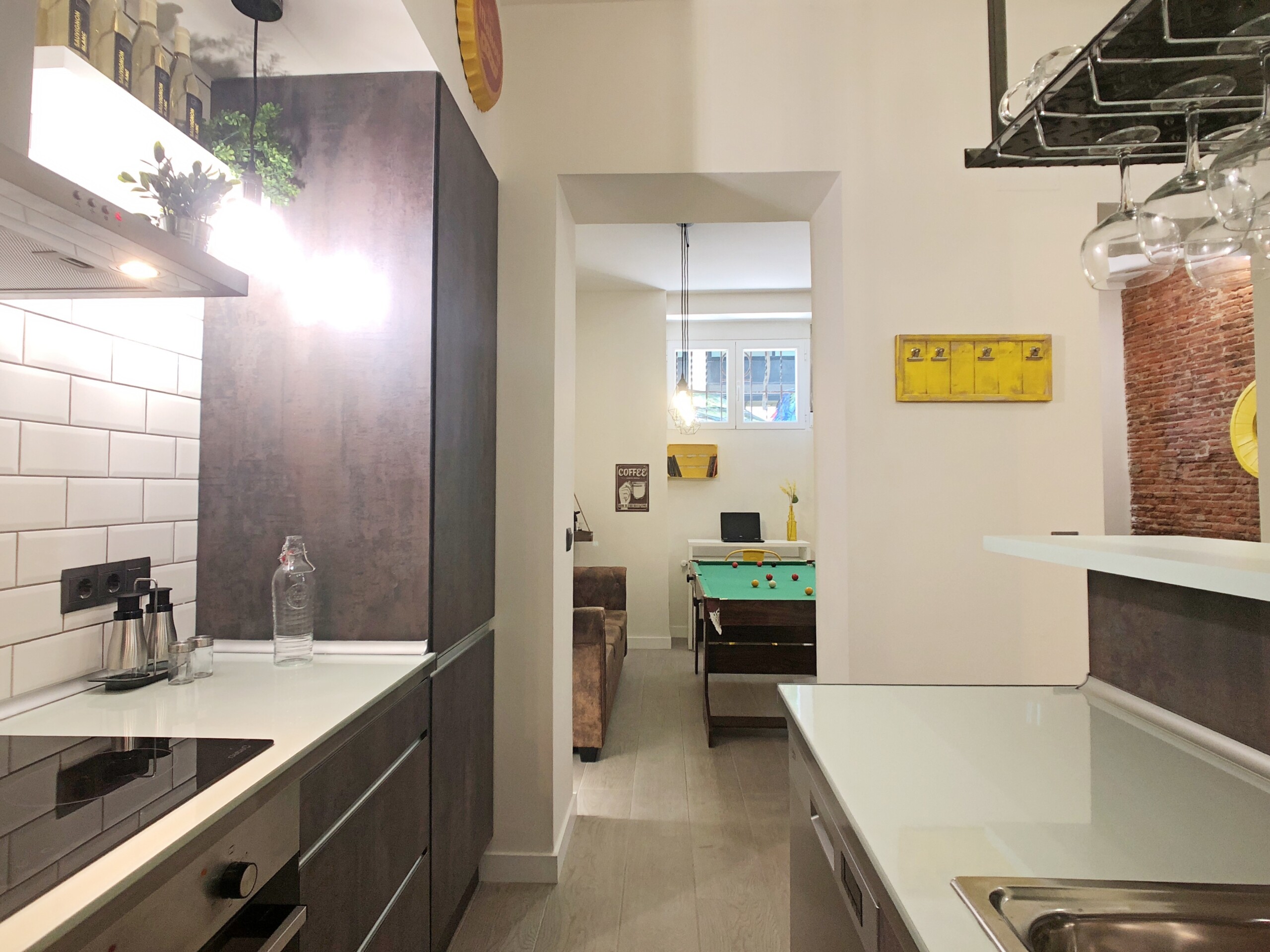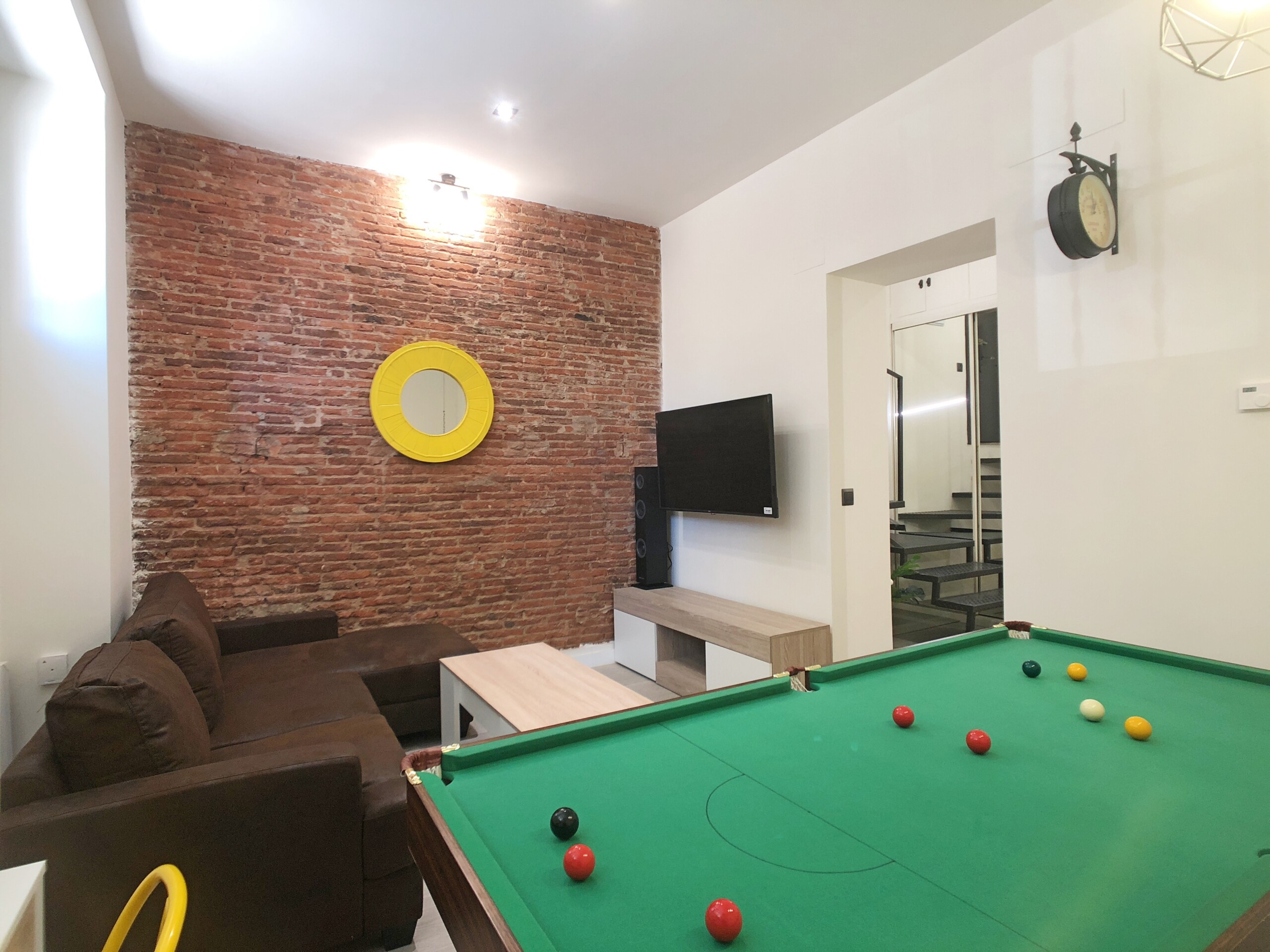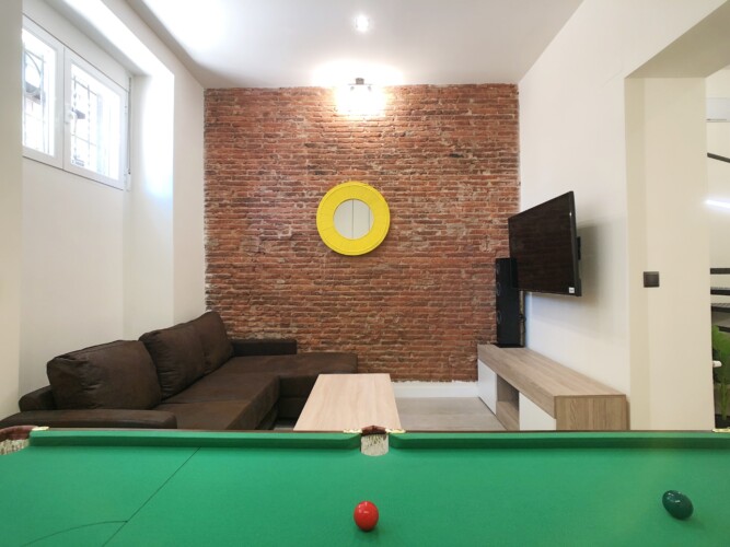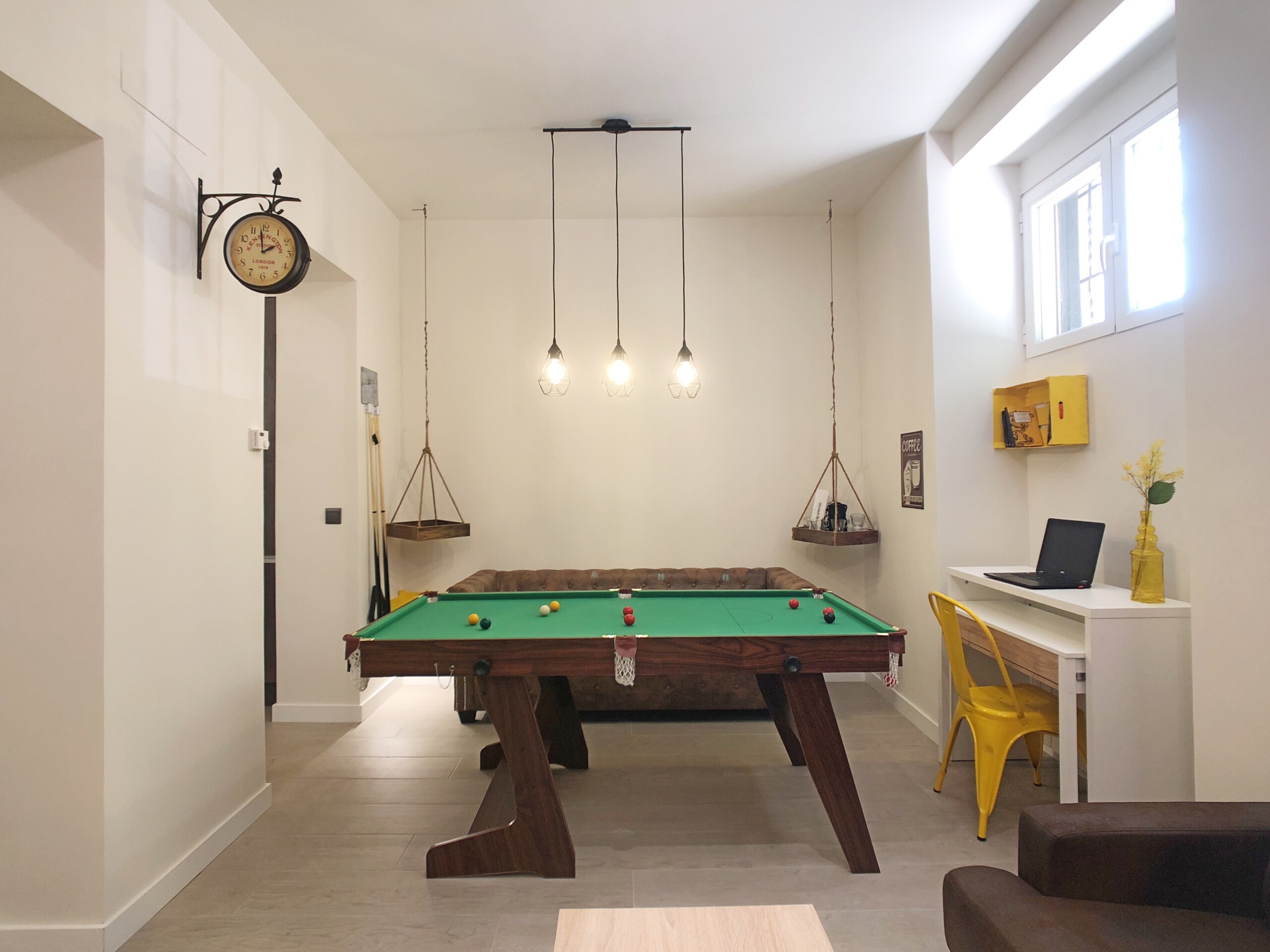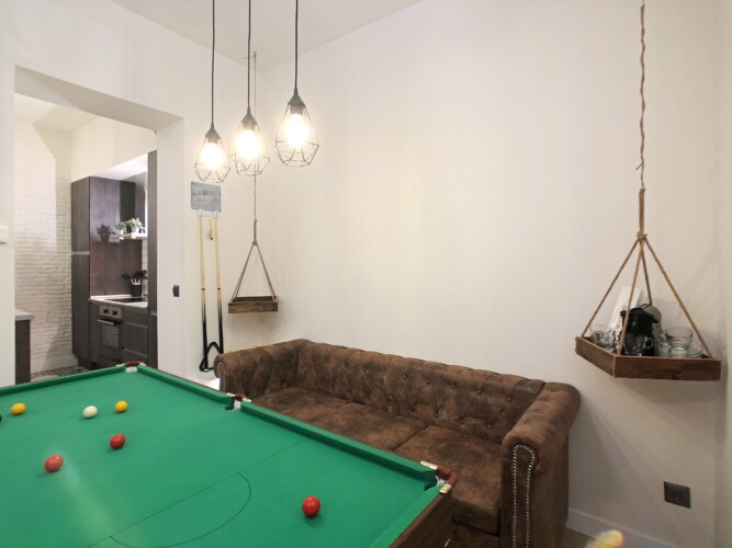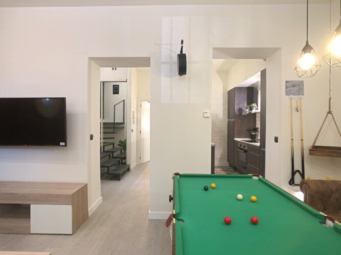 Desde la cocina accedemos a un amplio salón comedor, este espacio destaca por su original mesa de billar que hace las veces de mesa de comedor.