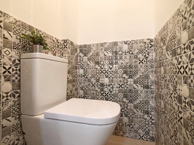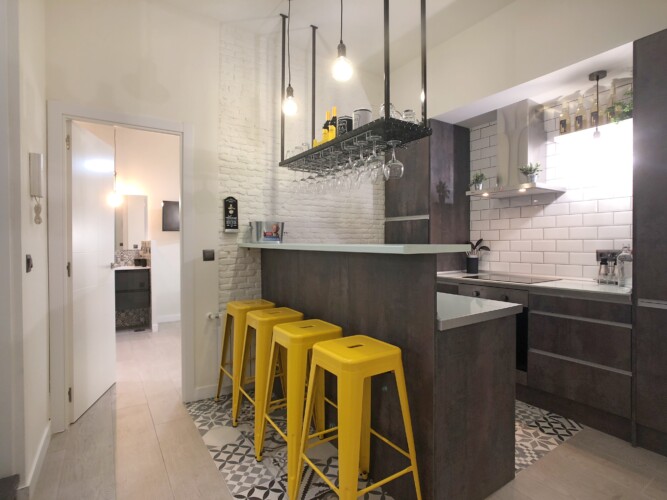 Al entrar en la vivienda accedemos a la zona de la cocina, ésta destaca por su originalidad, ya que su barra con estilo Pub inglés hacen de la misma un lugar único donde cocinar o tomar algo con la familia y amigos.