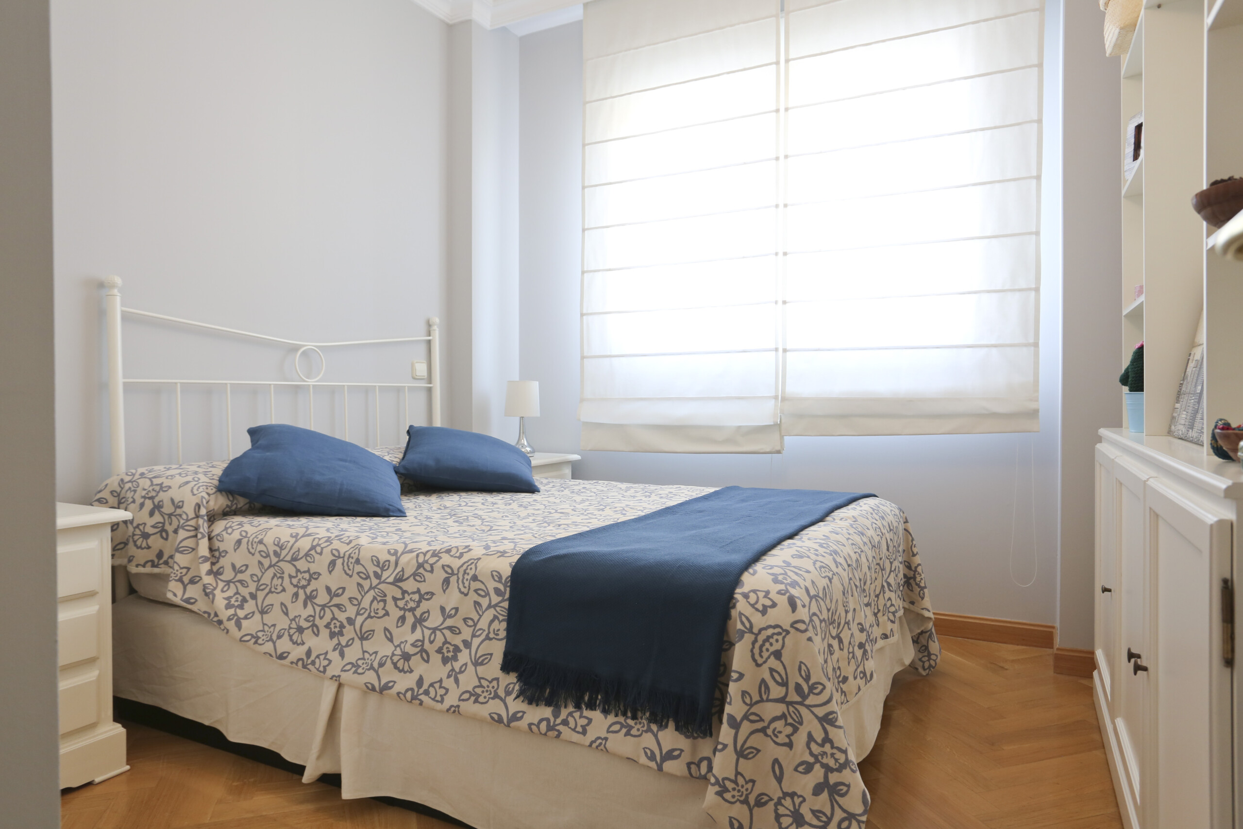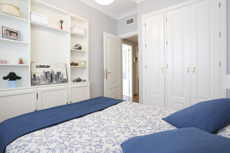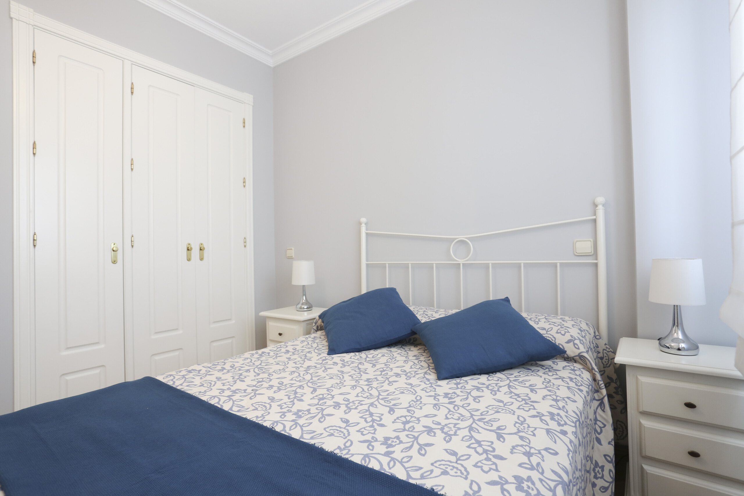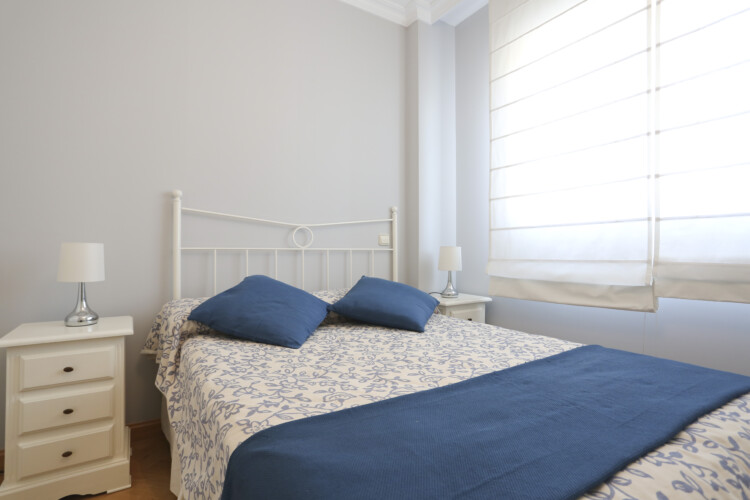 El dormitorio es luminoso, ya que dispone de un gran ventanal. En él encontramos una cama doble, dos mesillas de noche y un armario empotrado de 2 cuerpos.