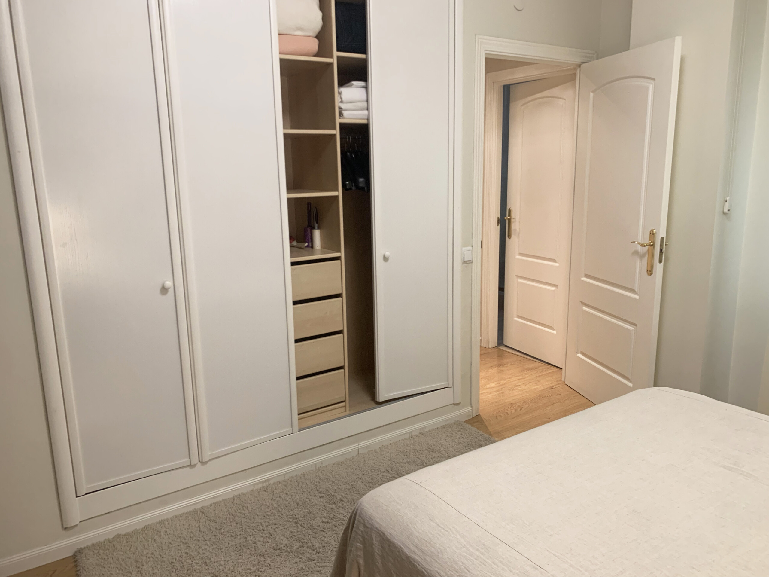 El dormitorio principal es muy amplio y alberga una cama doble, como de dos amplios armarios empotrados y un gran armario externo.