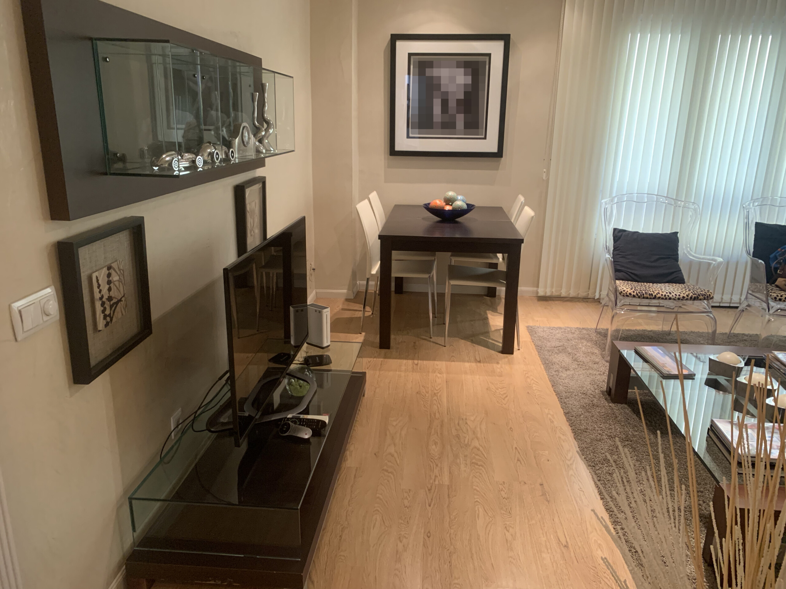 El salón alberga un sofá, mesa de comedor, así como una smart tv.