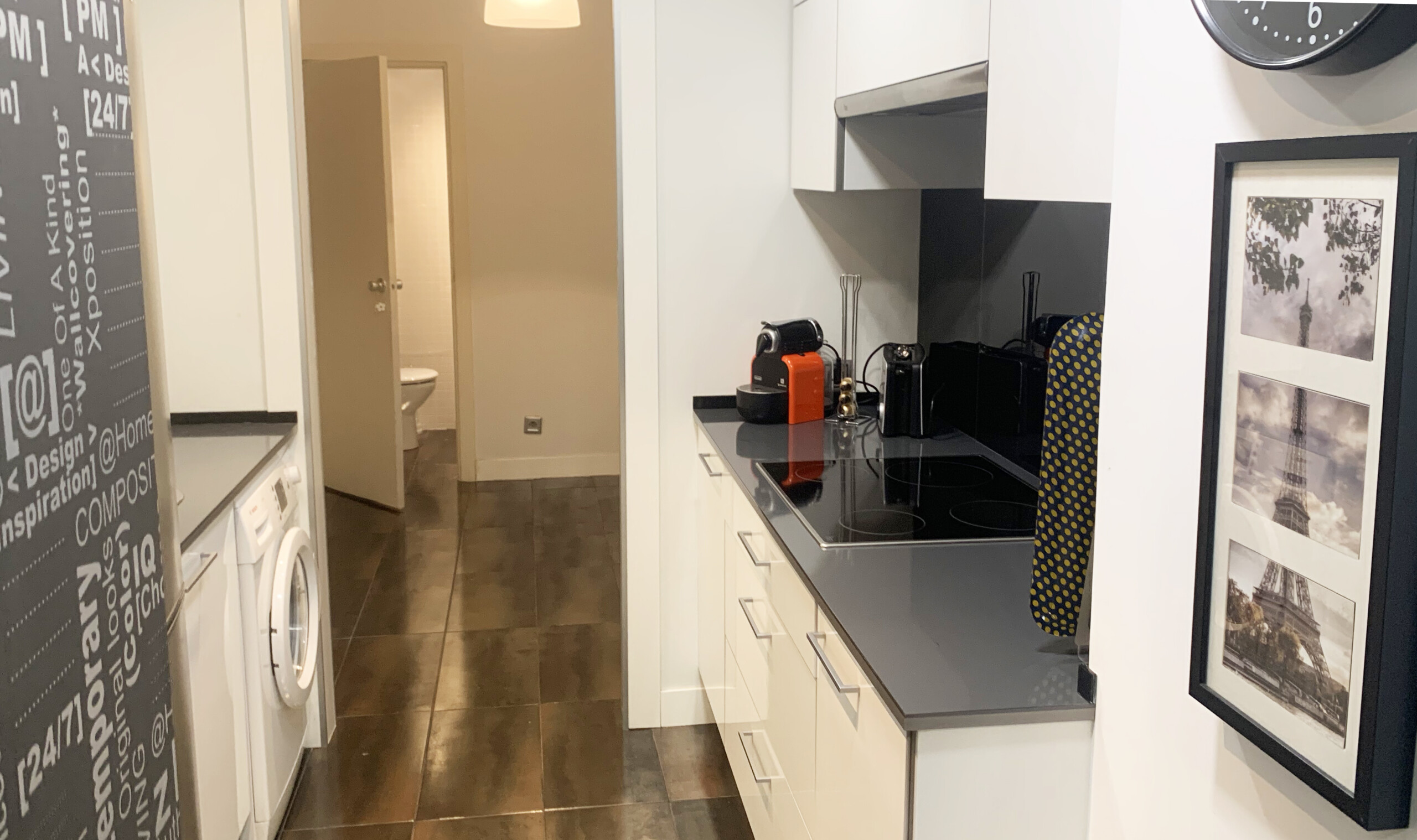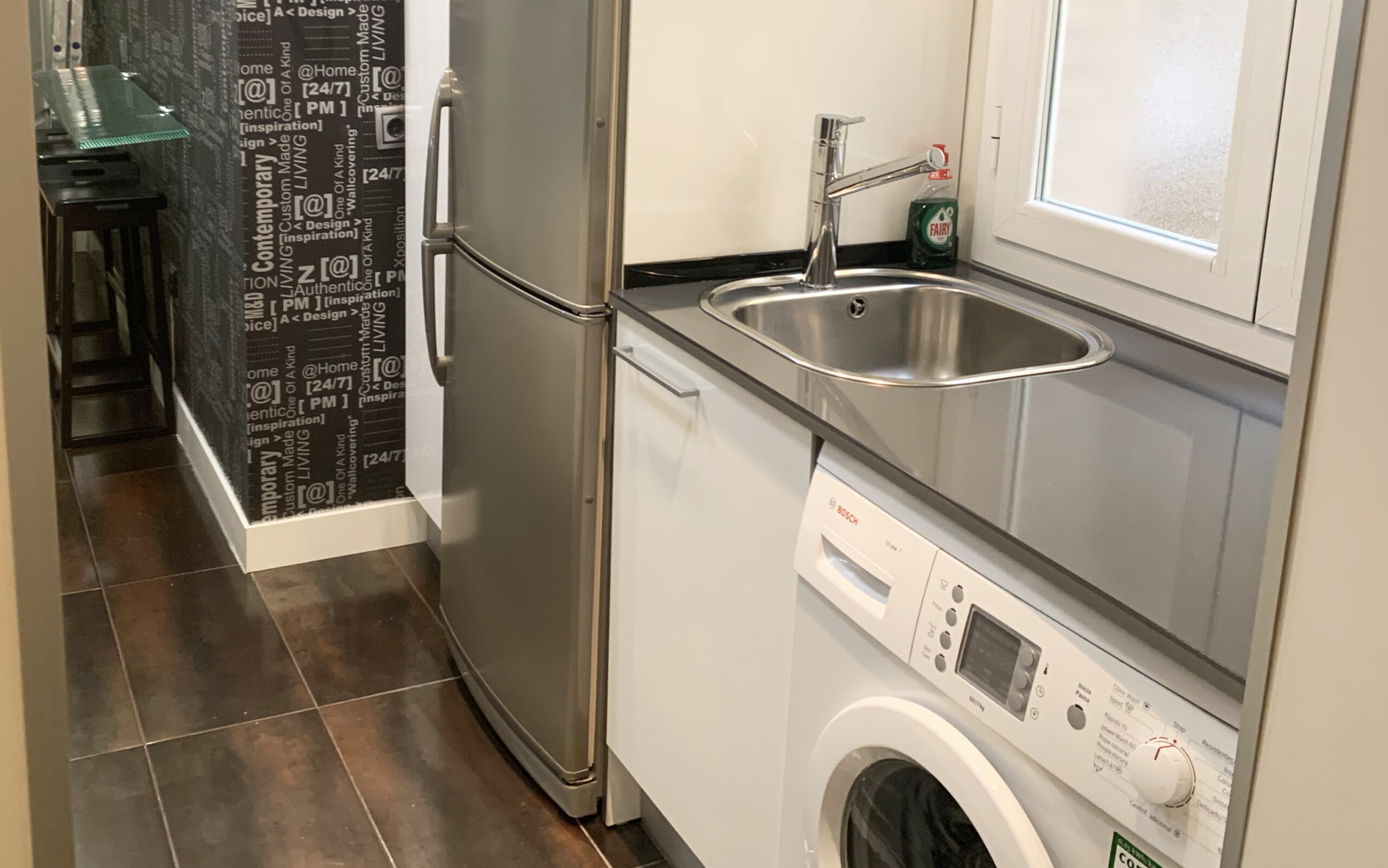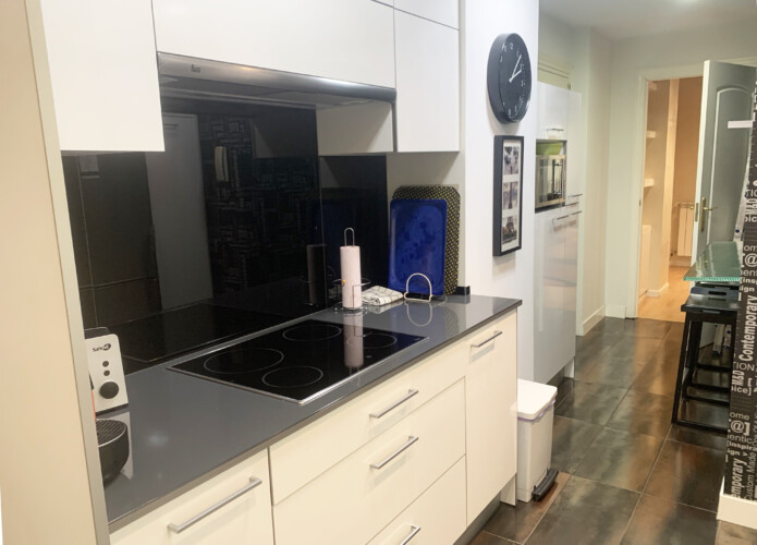 La cocina es amplia y dispone de todos los electrodomésticos, frigorífico, lavadora, lavavajillas, horno y placa de inducción, etc.