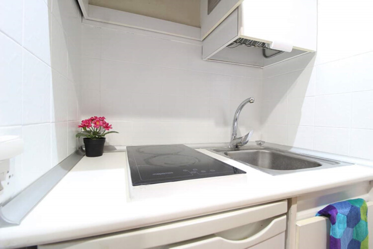 La cocina, con vitrocerámica, está empotrada en uno de los laterales de la vivienda, lo que la hace única.