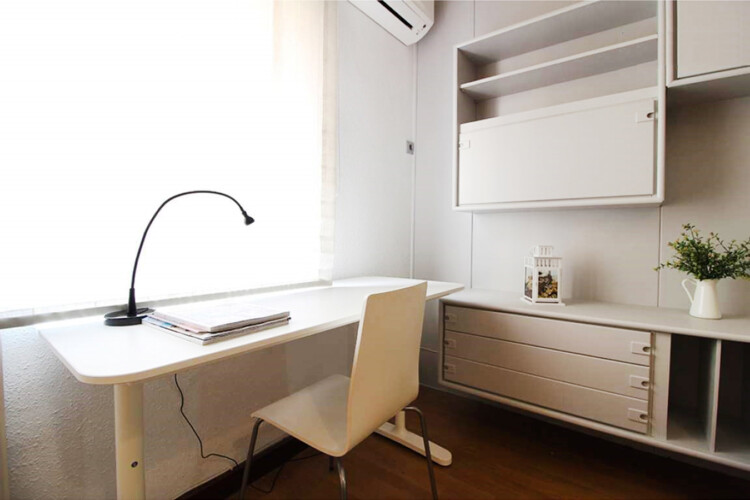 Destaca su gran armario empotrado y la gran zona diáfana donde está situada una cama doble (135 cm), un sofá con mesitas de salón, una mesa de trabajo y una gran librería.