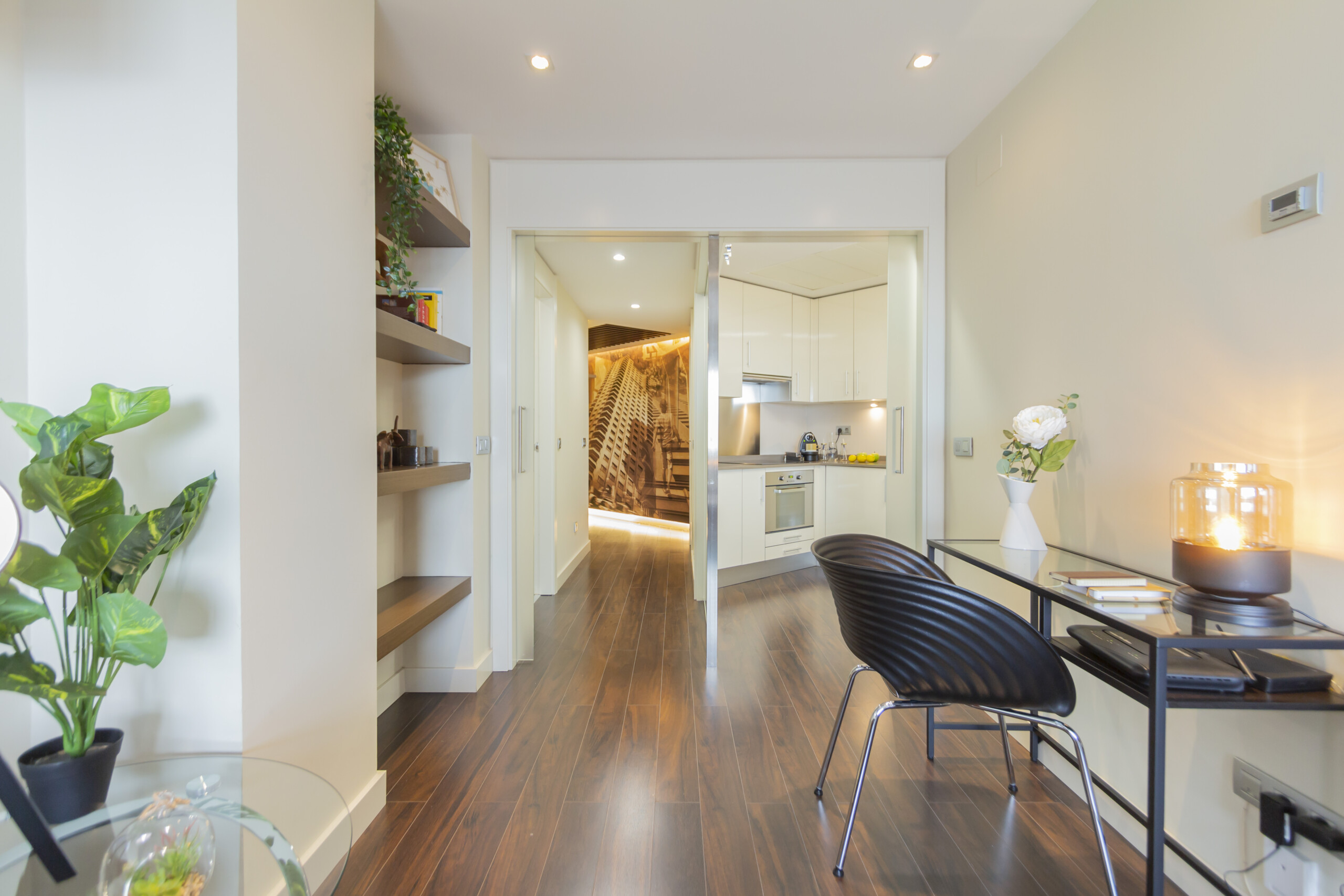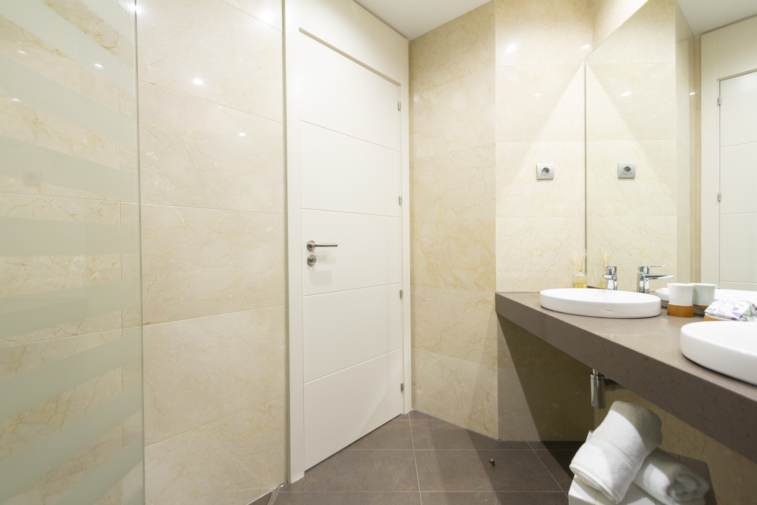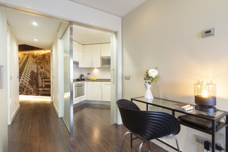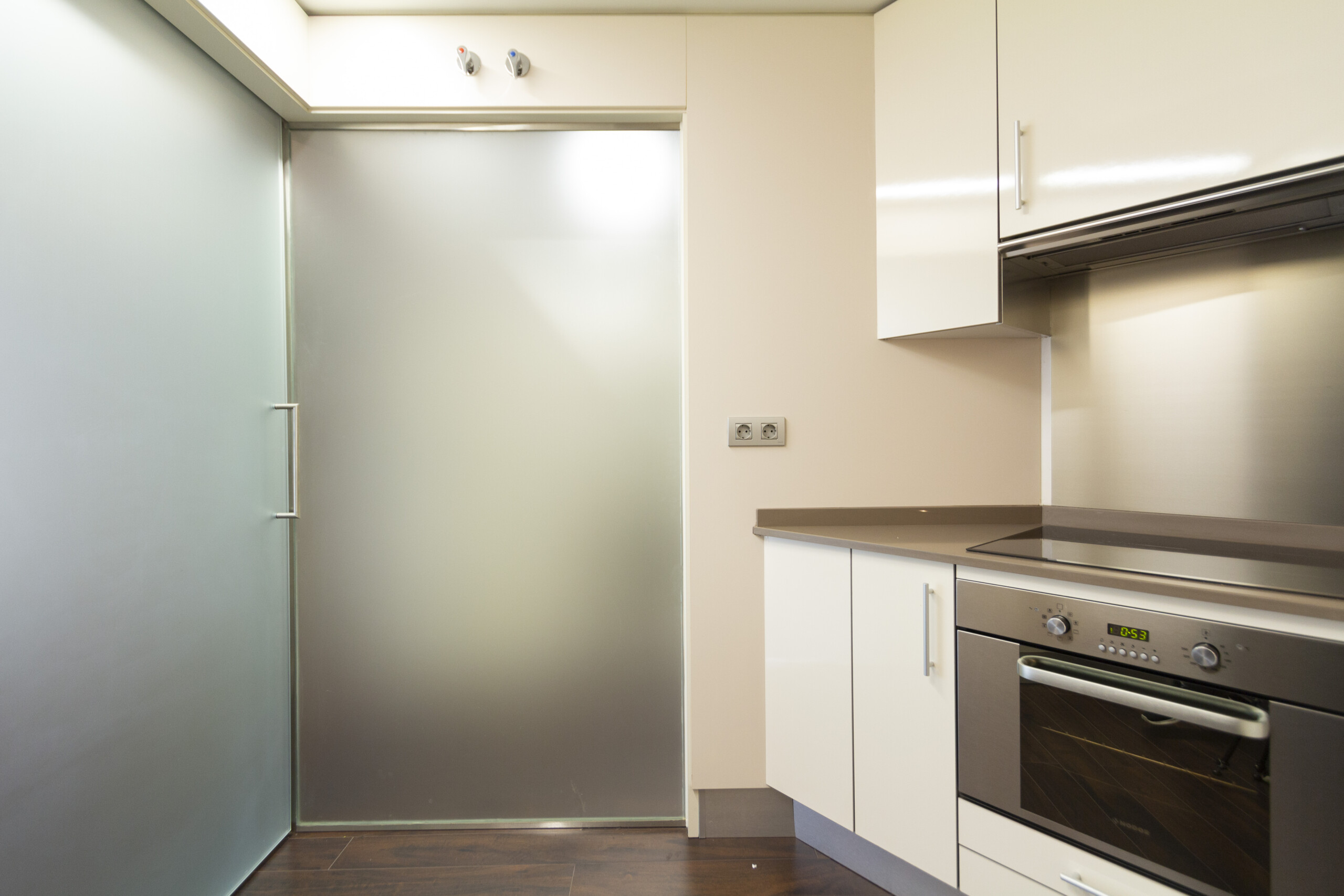Otro punto de interés de este apartamento es su fantástico cuarto de baño de diseño moderno, asi como su cocina, que alberga todos los electrodomésticos.
