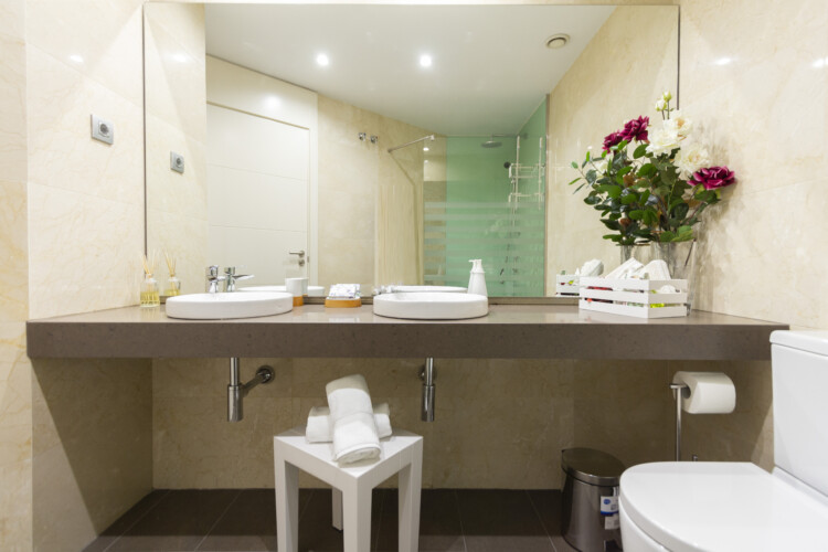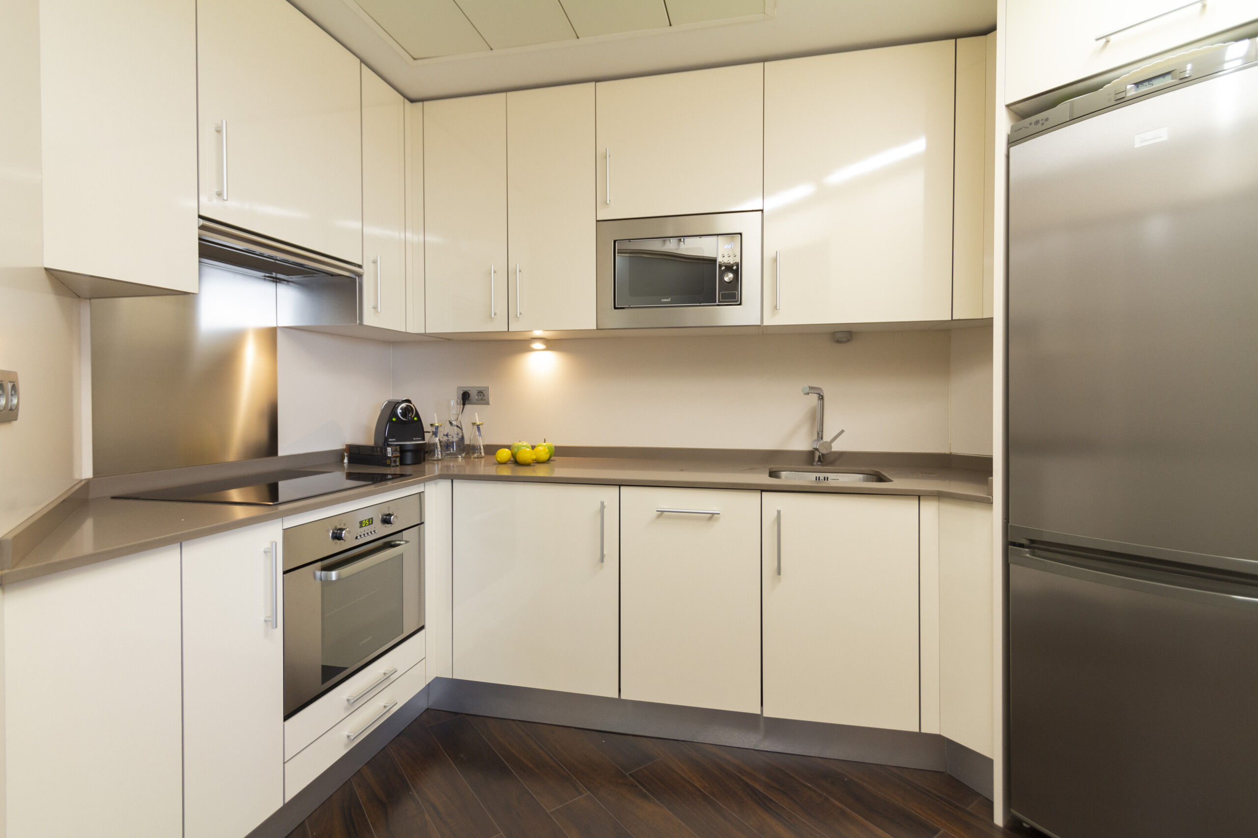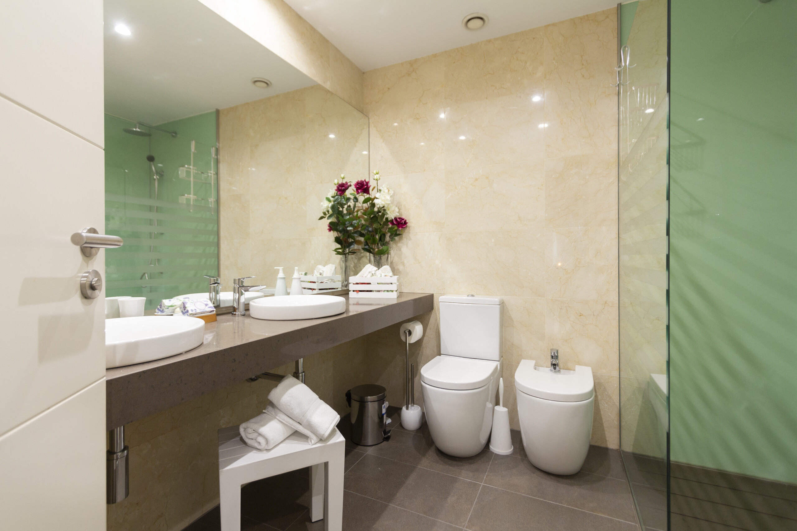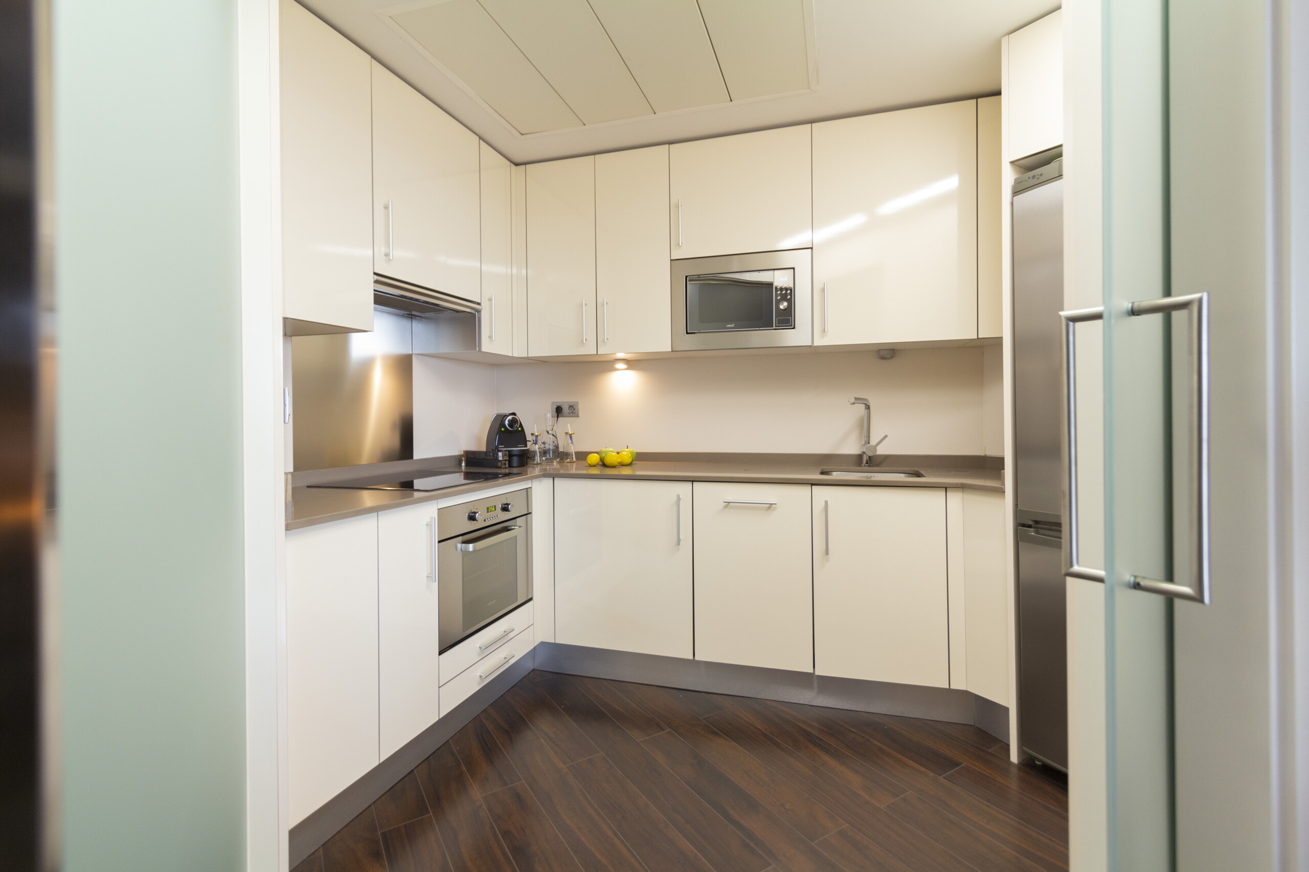 Otro punto de interés de este apartamento es su fantástico cuarto de baño de diseño moderno, asi como su cocina, que alberga todos los electrodomésticos.