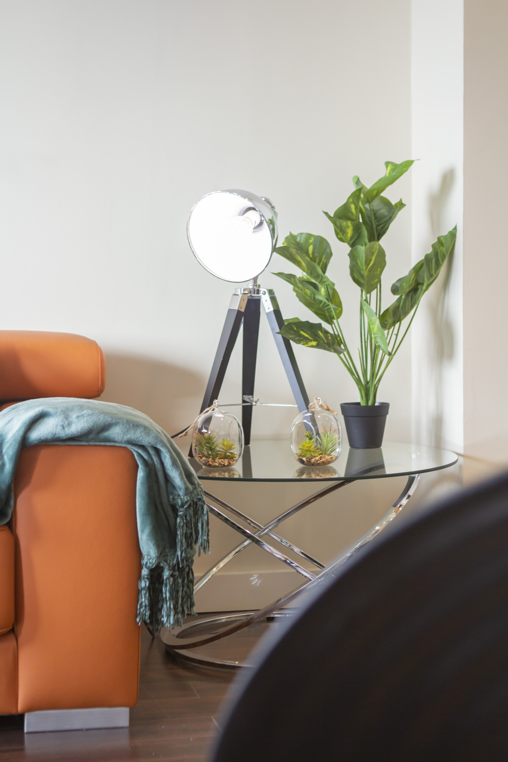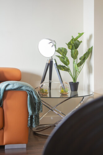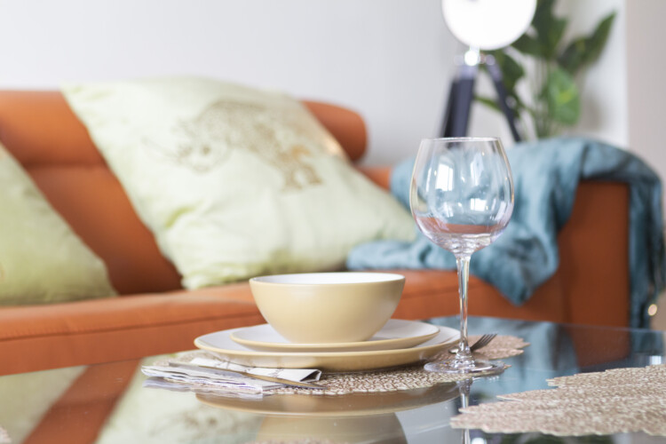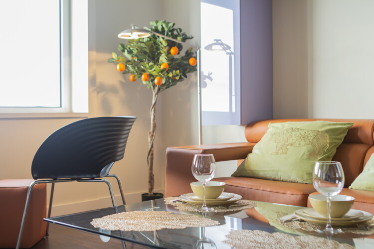 La mesa del salón es convertible en mesa de comedor, lo que permite albergar hasta cuatro comensales.